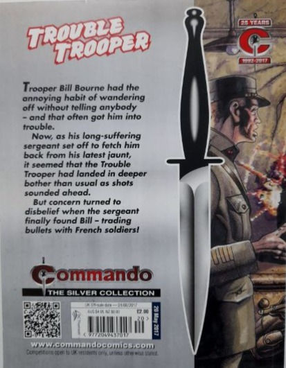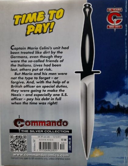 Commando For Action and Adventure, formerly known as Commando War Stories in Pictures, and colloquially known as Commando Comics, is a British comic book magazine that primarily draws its themes and backdrops from the various incidents of the First and Second World Wars. It was first published in July 1961 and is still in print today. It is noted for its distinctive 7 × 5½ inch, 68 page format that became a standard for these kinds of stories. Commando has remained more popular than many other British war comics, because of its character based stories and detailed black and white artwork, with only the covers in colour. It is considered by some to be one of the greatest war comics in history.
